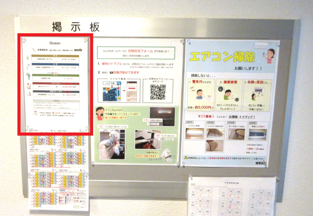 【 ガス会社 】 へ ご連絡お願いします。連絡先は 【 掲示板 】 に記載しております。